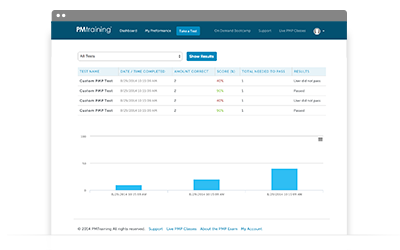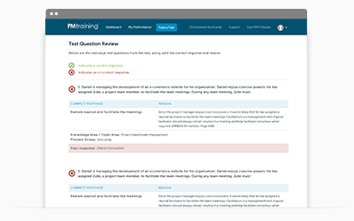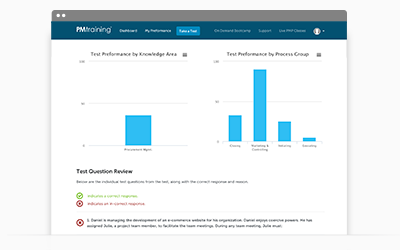 Use PMTraining's reports to review your performance by Standard for Program Management®, PgMP Exam Domain, scoring trends over time, and detailed analysis of past test results.