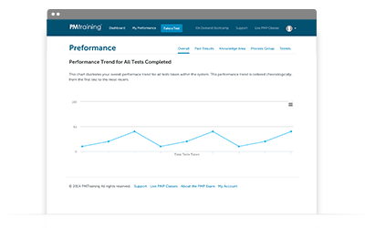 The personalized My Performance tab will help you focus your PgMP study efforts by analyzing your performance. Each PgMP practice test you take is tracked to give you a summary view of your performance trend over time.