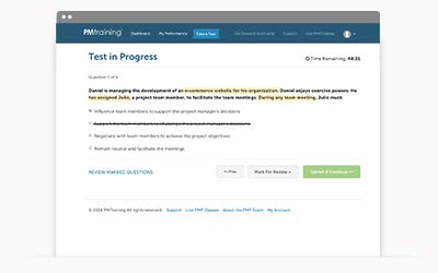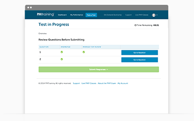 Mark your responses for review later, return to any PgMP test question before getting results, and take the test using the same time limits as the real exam.